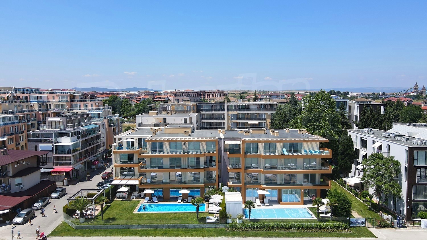 Olympia Beach is a fantastic complex of luxury apartments with first line beach–front location at the Black Sea resort of Ravda. It enjoys a quiet and convenient, green location very close to the picturesque old town of Nessebar. Nearby is located also the famous international resort of Sunny Beach. Very close to the property are two newly built aqua parks – one between Ravda and Nessebar and one in Sunny Beach resort. Located on the beach, the complex has spectacular views towards the Sea and a provides a unique combination of greenery, tranquility and comfort.