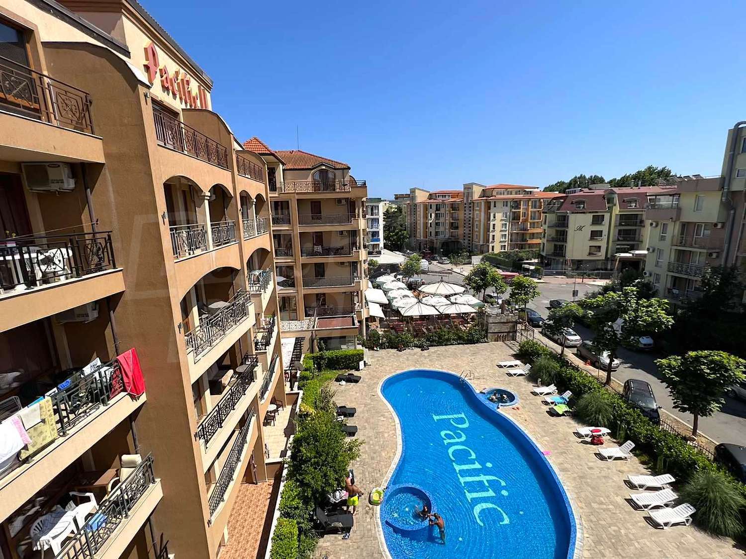Ready-to-move-in 1-bedroom apartment in the gated complex "Pacific II" in Sunny Beach, just a 5-minute walk from the beach with a 60-meter wide and 300 meters from the bus stop. The apartment is suitable for year-round living. It offers a pleasant view of the courtyard with a pool.