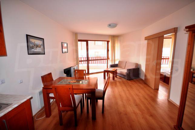 Panoramic 1-bedroom apartment with sunny southeastern exposure and view of Pirin Mountain in the Pirin Place complex without maintenance fee, with unique location on the first line from the ski lift, opposite the Kempinski Grand Hotel, near Ginger Bar and Dinner, shops, cafes and restaurants, ski school and a number of other city amenities.