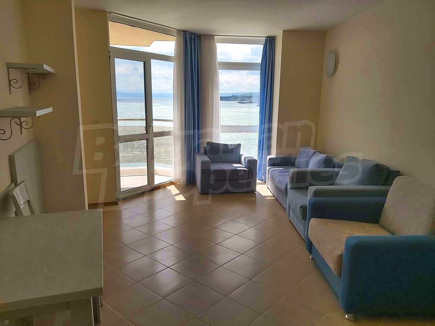 Comfortably furnished and equipped seafront one-bedroom apartment with magnificent sea view in gated complex Royal Bay with private beach. The luxury apart-complex was built in 2009 in Mediterranean style, located in one of the most picturesque bays on the Northern Bulgarian Black Sea coast - Ikantalaka area between Balchik and Kavarna. In addition to the private beach, the complex offers its guests a restaurant with outdoor terrace, a gorgeous outdoor swimming pool with children's section, a fitness room, a sushi bar, a beach bar, Wi-Fi in the lobby bar and restaurant, guaranteeing high level of modern comfort for your sea holidays.