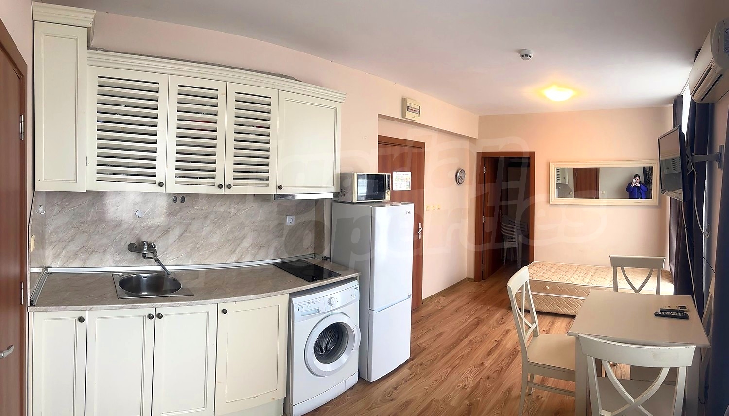 We offer for sale a bright, fully furnished and equipped one-bedroom apartment with a large panoramic terrace overlooking the swimming pool in Dawn Park complex with Permission for use /Act 16/. It is open all year round and is located in the quiet part of Sunny Beach, next to the water park and only 10 minutes walk from the downtown area and the beach.