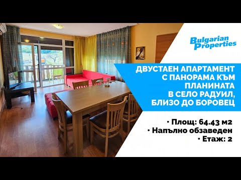 We are delighted to present this charming, fully furnished two-bedroom apartment with breathtaking views of the mountains and the picturesque village of Raduil. The property enjoys an excellent location in a peaceful mountain area — only 9 km from the ski resort of Borovets, 22 km from Samokov, 16 km from the SPA resort of Kostenets, and 80 km from Sofia.