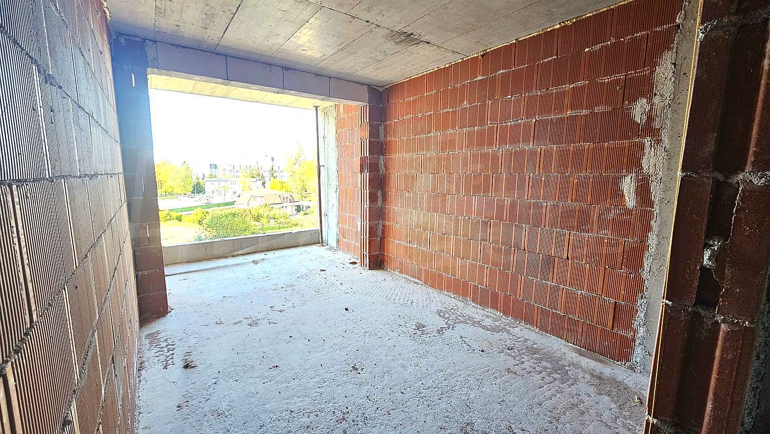 The apartment offers a functional and bright layout, featuring an entrance hall, spacious living room with a kitchen area and balcony access, a comfortable bedroom, bathroom with WC, and a large storage/utility room. Large windows allow plenty of natural light and a sense of openness, while the layout provides flexibility for personal finishing touches.