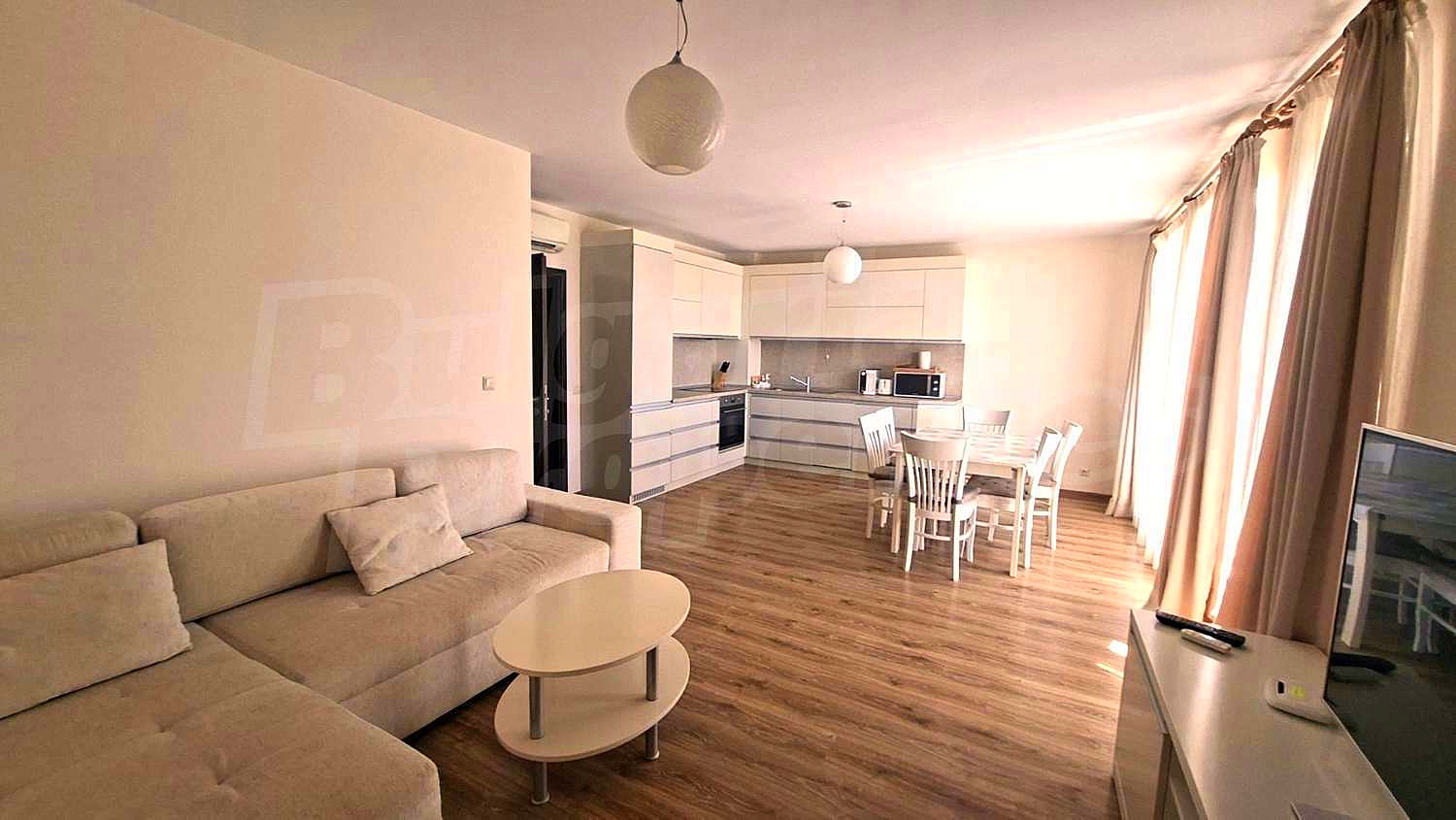 Spacious two-bedroom apartment with Act 16, comfortable layout and modern design of the furniture in a gated complex built at the sea in Obzor, 200 m from the beach. The maintenance fee is 15 euro / 29.34 BGN / sq.m.