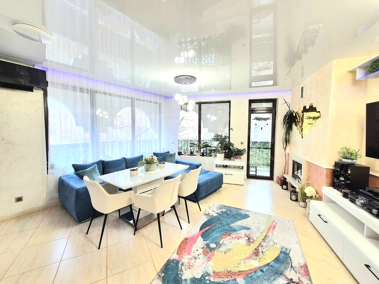 The interior features high-end finishes throughout. The walls are finished with luxurious Italian plaster, while the ceilings are completed with a premium Barrisol stretch system. The apartment is equipped with smart LED lighting and top-quality appliances. A spacious entrance hall leads to a bright, south-facing living area with a bio-ethanol fireplace, elegant furnishings and a comfortable seating zone. The kitchen is fully fitted and designed for maximum functionality.