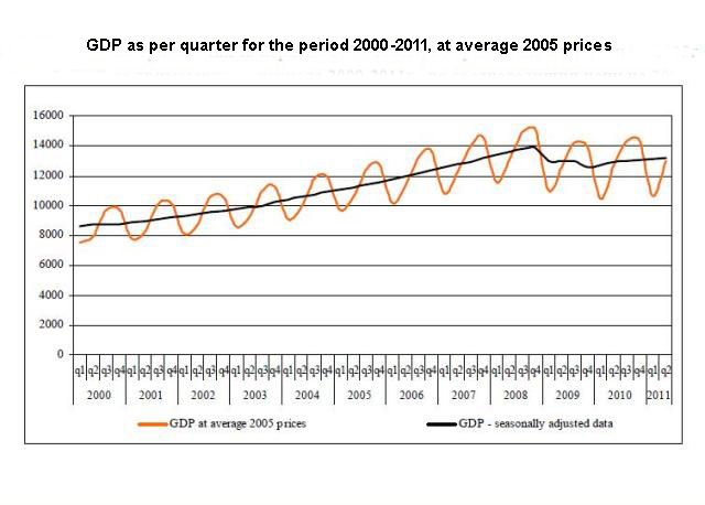 Latest data of the Bulgarian National Statistical Institute show that in the second quarter of 2011 the Gross Domestic Product (GDP) of Bulgaria amounts to 18,804 million Bulgarian Leva as per current prices. Recalculated in Euro GDP is 9,614.3 million as the amount per capita is 1,284.1 Euro. The seasonally adjusted data for the country’s GDP show an increase of 0.3% in the second quarter of 2011 compared to the first quarter and an increase of 2.0% in the second quarter compared to the same period in 2010.