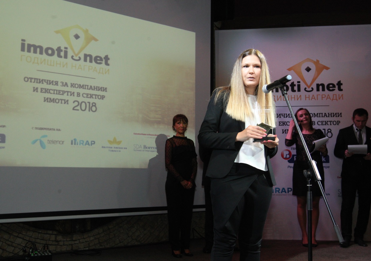 Magdalena Tosheva, in turn, told the audience: "It is a great honor for me to receive the most prestigious award - "Broker of the Year" at the Annual Awards of Imoti.net for 2018. I am proud to be part of the team of BULGARIAN PROPERTIES for more than 10 years now and I would like to thank them sincerely for the unconditional support and trust. We are happy to work with some of the most serious construction entrepreneurs and investors and help them with the sales of their new developments. An example are residential complexes such as Vitosha View, Modera Residence, Sofia North Park and many others which sell successfully."
