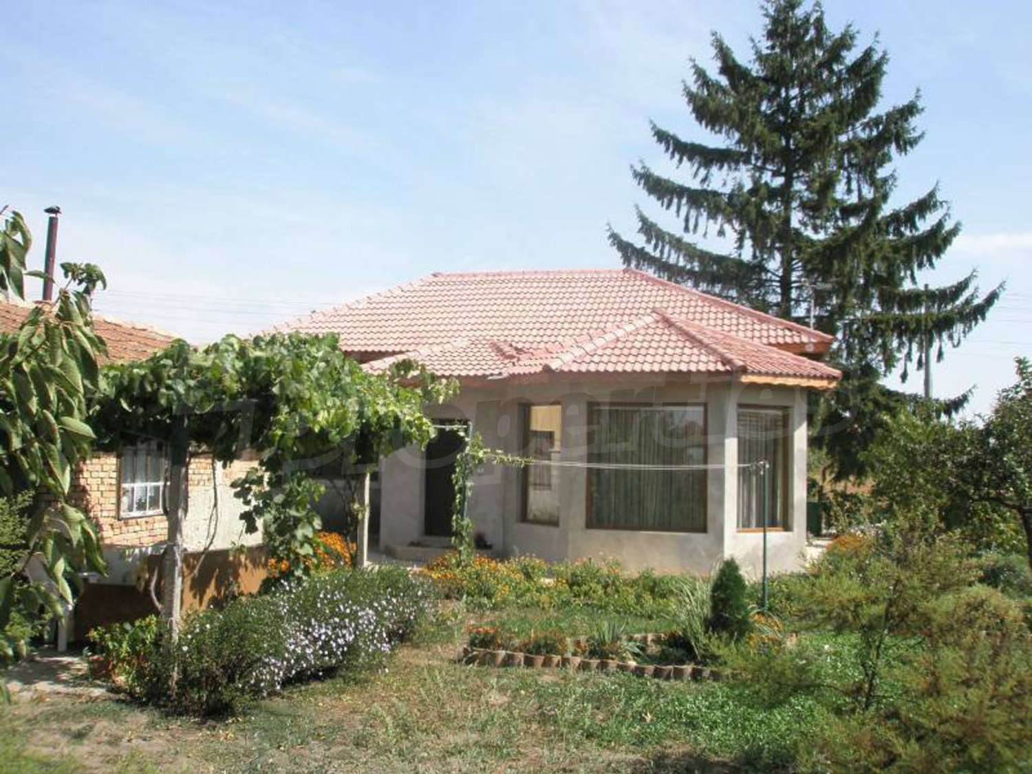 The yard is 1000 square meters (34 meters facing the street, square shaped). There is a new and an old house, many fruit trees like cherries, pears, apples, almonds, prunes, walnuts, quince, peaches , apricots, walnut, mulberry, peach, raspberry and many strawberries and flowers.