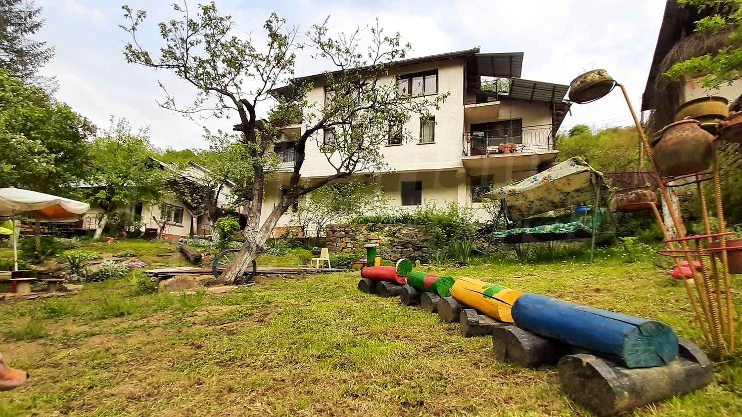 It is important to note that the house is divided into two halves and the description above refers to one half and the property includes another such part.The yard is beautifully arranged, bordering a small creek in its lower part.