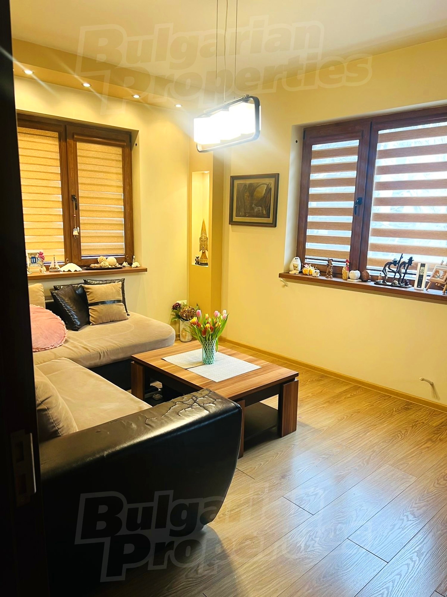 The dwelling is completely renovated, with PVC windows, internal insulation, floor - laminate, parquet, terracotta tiles, solid interior doors and roof in excellent condition. The heating is with air conditioners and convector heaters. The full furniture and equipment can be seen in the photos. The property overlooks the monument 1300 years of Bulgaria and the entire city.