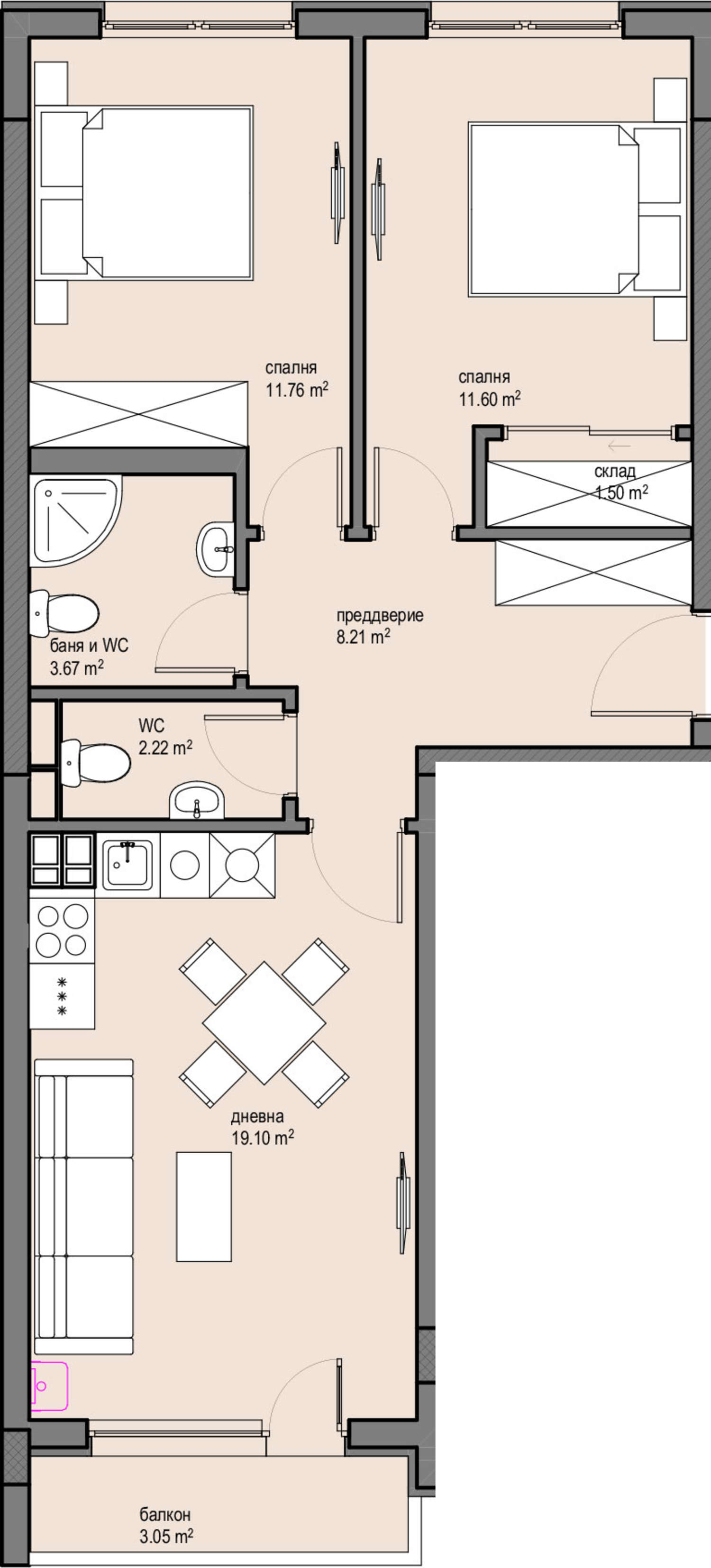 We are pleased to present to your attention a new project with spacious homes with 2 bedrooms in the more peripheral but populated neighborhoods - Krasna Polyana. The location offers proximity to the new metro station Ovcha Kupel, for easy connection with some major universities
