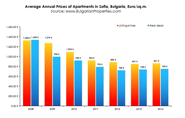During 2014 there were 2 periods with different market dynamics– the first half of the year, in which real estate attractiveness and prices remained unchanged compared to 2013 and the second half of the year in which the number of deals increased rapidly, the supply started decreasing, and the real prices, as well as the asking prices, started slowly increasing. These processes lead to 3% increase in the prices of apartments in the Bulgarian capital.