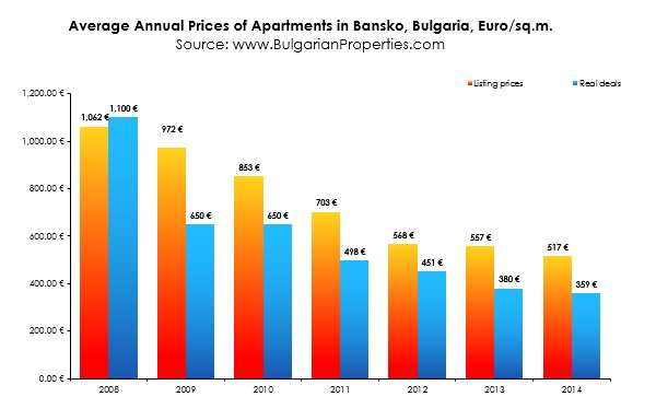 Throughout 2014 the drop in the prices in Bansko continued, but the good news is that the price changes are now below -5% and we may expect more deals during the already very active winter season.