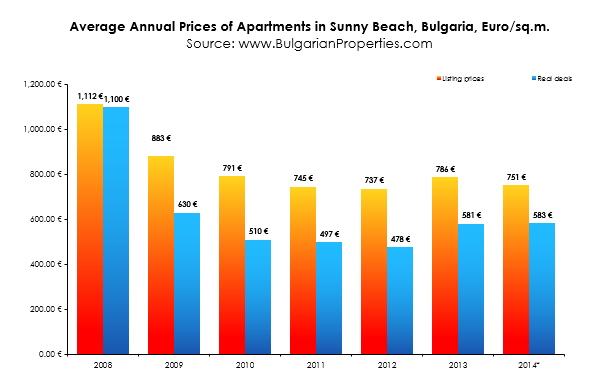 The average price per square meter of purchased apartments in Sunny Beach in 2014 was 582 Euro/sq.m. and remained unchanged compared to 2013 (580 Euro/sq.m.). The average overall price of purchased apartments in the resort for 2014 was 32,550 Euro.