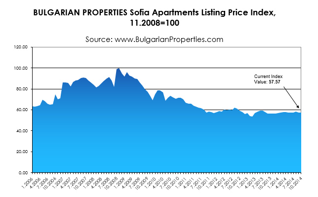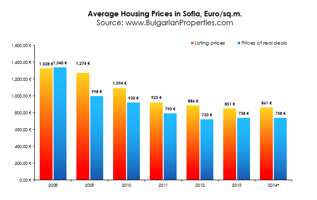 The average price of apartments sold in Sofia in the third quarter of 2014 is 750 Euro/sq.m, according to BULGARIAN PROPERTIES. It remains almost unchanged compared to the same period of 2013, when the average selling price calculated by BULGARIAN PROPERTIES was 740 Euro/sq.m.