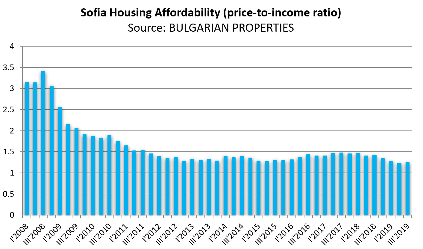 The affordability indicator is well below its peak value in 2008, when 3.5 monthly salaries were needed to purchase 1 sq.m. residential area in Sofia.