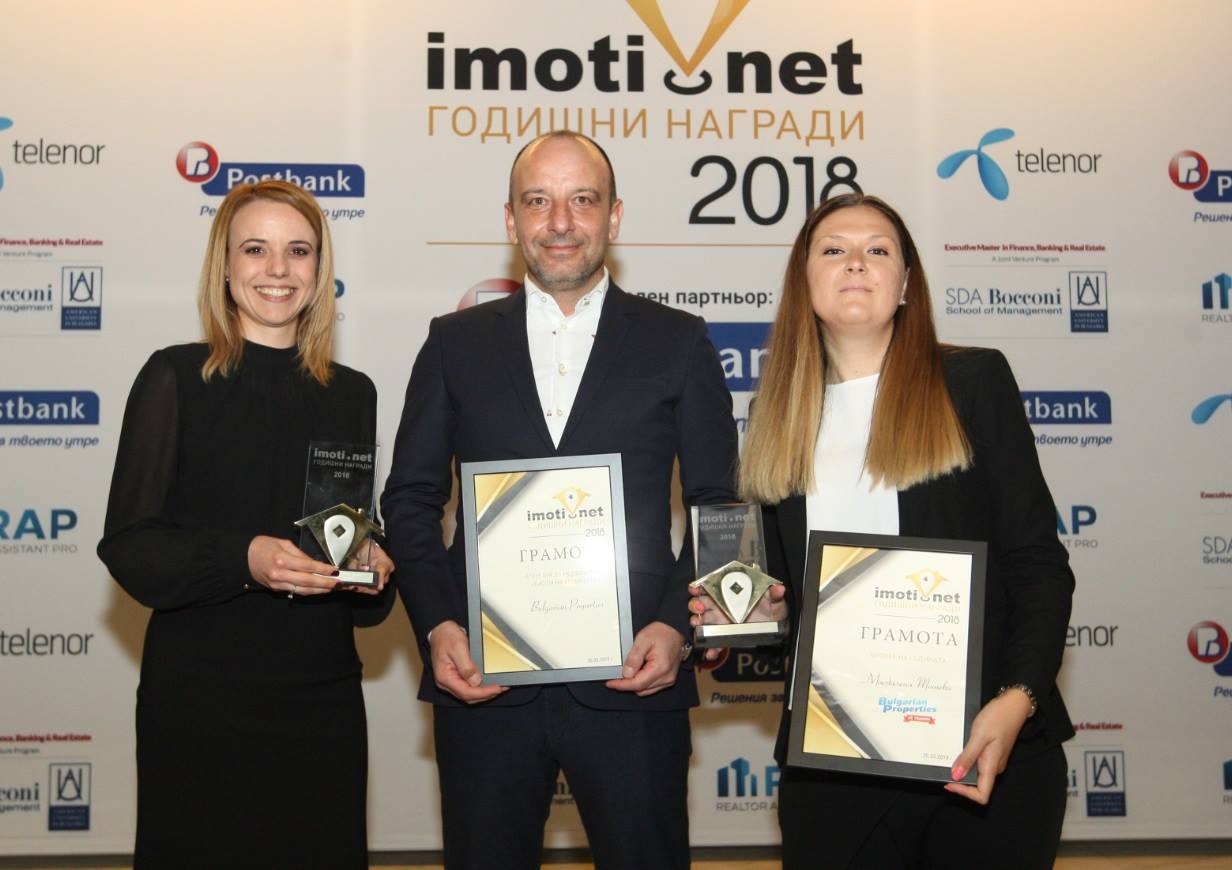 Magdalena Tosheva, in turn, told the audience: "It is a great honor for me to receive the most prestigious award - "Broker of the Year" at the Annual Awards of Imoti.net for 2018. I am proud to be part of the team of BULGARIAN PROPERTIES for more than 10 years now and I would like to thank them sincerely for the unconditional support and trust. We are happy to work with some of the most serious construction entrepreneurs and investors and help them with the sales of their new developments. An example are residential complexes such as Vitosha View, Modera Residence, Sofia North Park and many others which sell successfully."