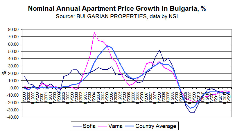According to NSI annual data the biggest price drops in 2011are registered in Dobrich (-10.28%), Gabrovo (-17.27%), Pernik (-12.58%), Shoumen (-15.03%), Veliko Tarnovo (-10.79%) and Vidin (-11.8%).
