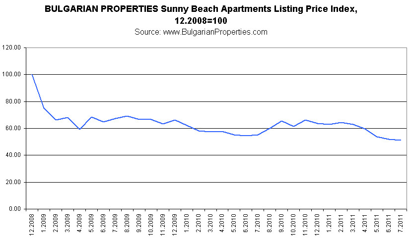 BULGARIAN PROPERTIES’ index of the listing prices of apartments in Bulgaria’s biggest seaside resort – Sunny Beach – shows that at present prices of holiday apartments there are 50% lower compared to their peak values in 2008.