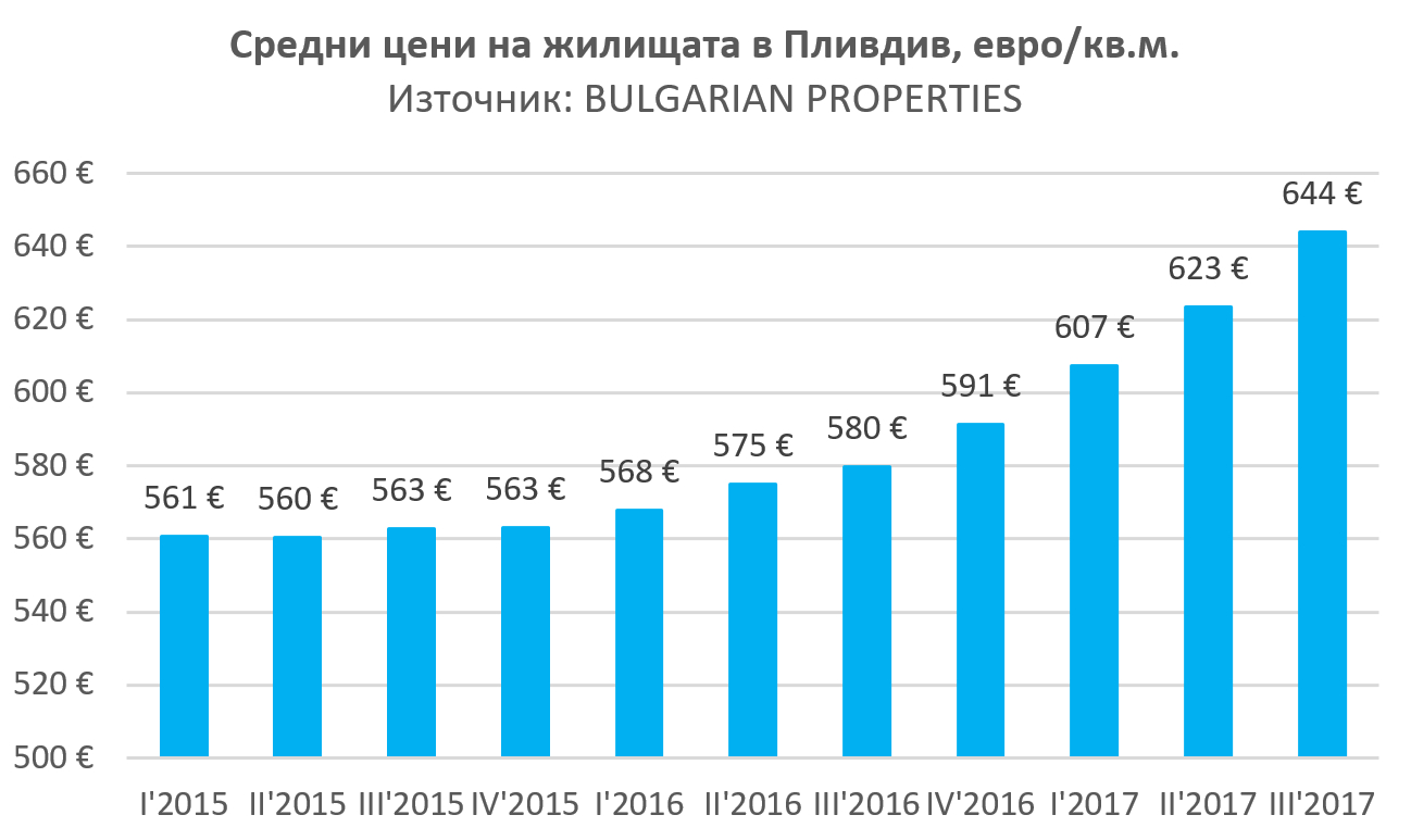 The tangible rise in prices began at the end of 2016, reaching 11% in the third quarter of 2017, according to BULGARIAN PROPERTIES. The average sale price of the dwellings in Plovdiv is 650 Euro/sq.m. for this period, as transactions are made even at higher than the average prices - about 700 Euro/sq.m., according to company data.