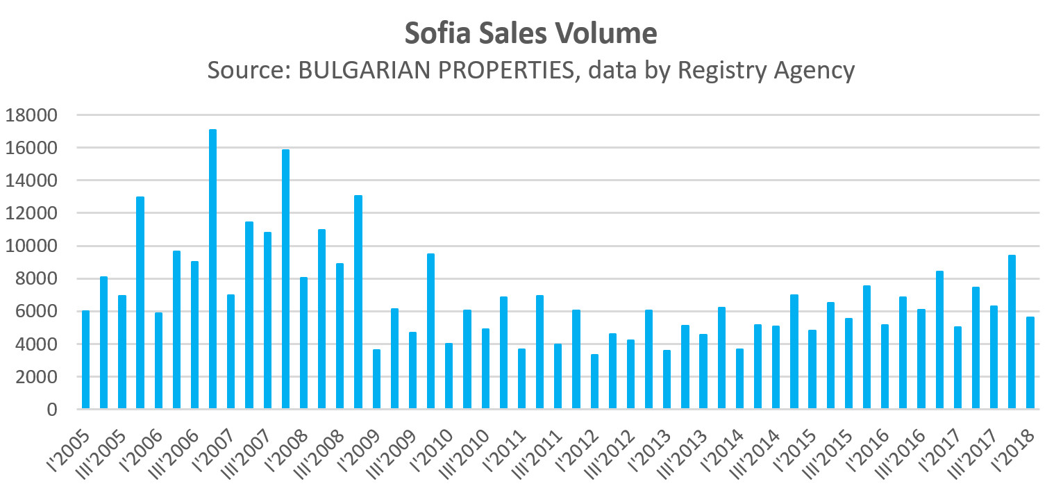 According to the data of the Registry Agency for the first quarter, 5631 real estate sales were registered in Sofia compared to 5023 for the same period in 2017, resulting in an increase of 12% on an annual basis.