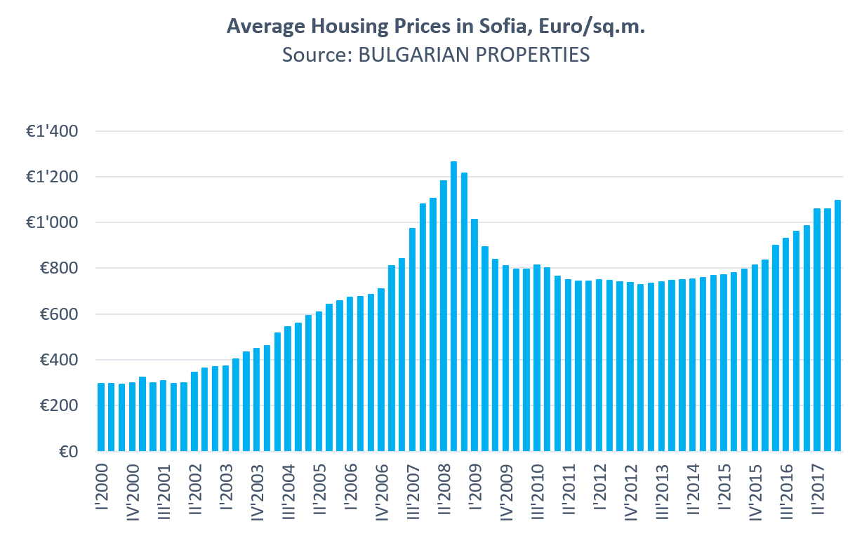Overall, in 2017 the market in Sofia ended the year with an average price of 1,050 Euro/sq.m. and an average annual price increase of 16%. This is accelerating growth in capital prices from 2016 when we measured an increase of 14.7%.