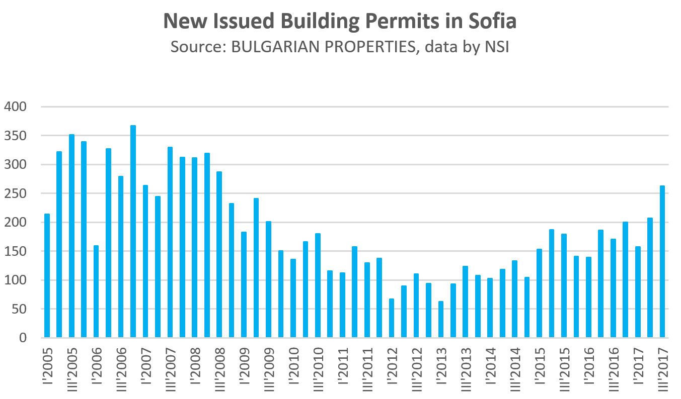 National Statistics Institute (NSI) data on new building permits revealed that 262 new permits were issued in the third quarter of 2017, the highest quarterly level for nearly 10 years. With this information, for the first 9 months of the year, the building permits for residential buildings in Sofia are 626 compared to 495 for the same period in 2016, which is a growth of 26.5%.