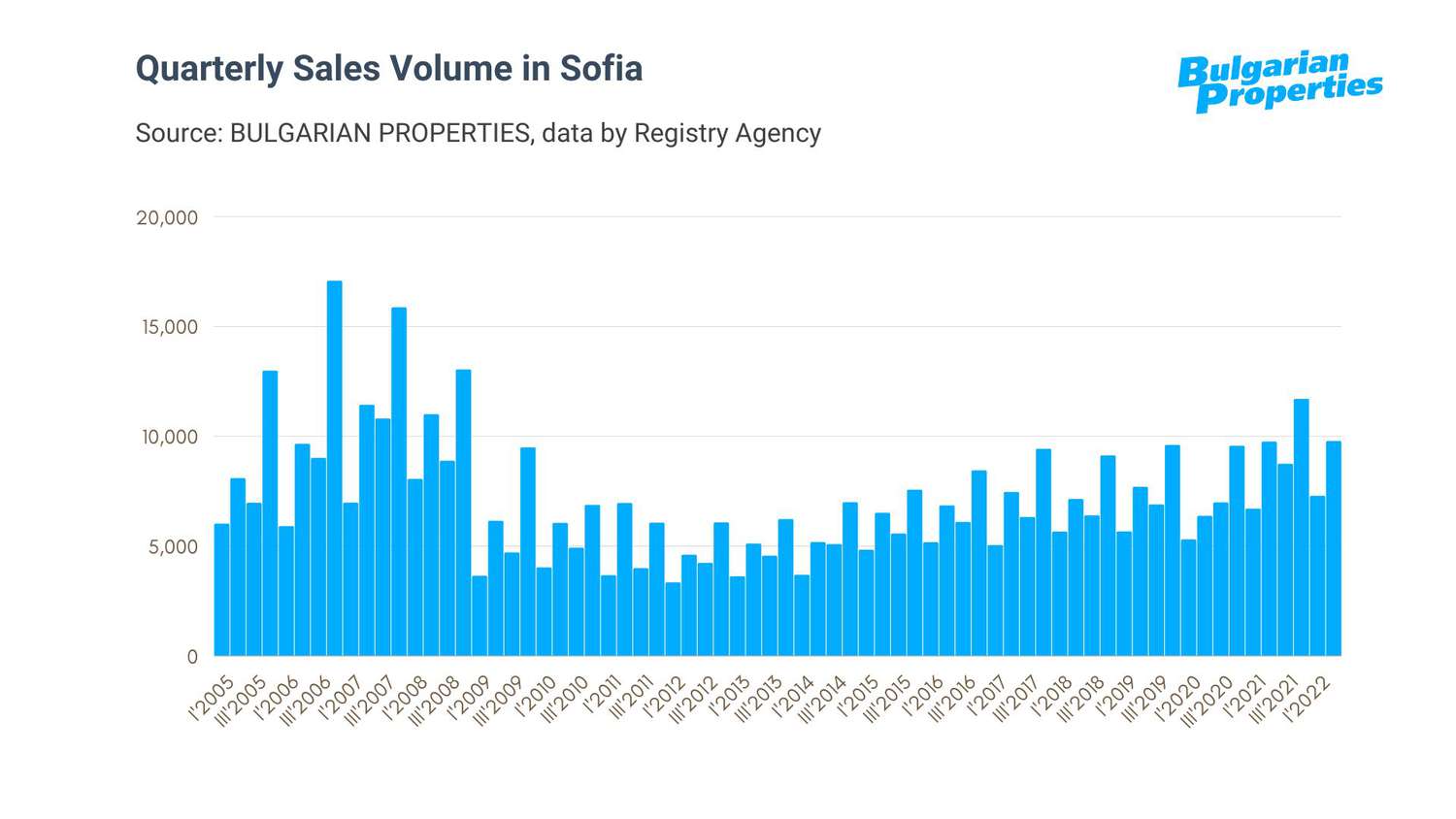 At the end of 2021 the price levels from the peak in 2008 were reached, and at the moment apartments in Sofia are being sold for around 160 Euros/sq.m. above these levels.