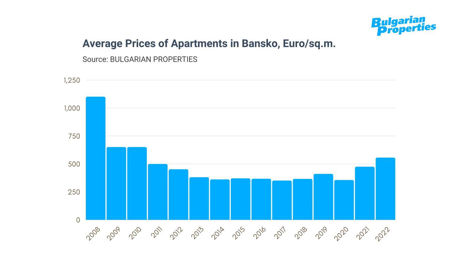 The average price of properties in Bansko for 2022 is 555 Euros/sq.m., and in the last quarter of the year BULGARIAN PROPERTIES reports an average price of 685 Euros/sq.m. The average price of the purchased apartments reached nearly 50,000 Euros. These are the highest prices since 2010.