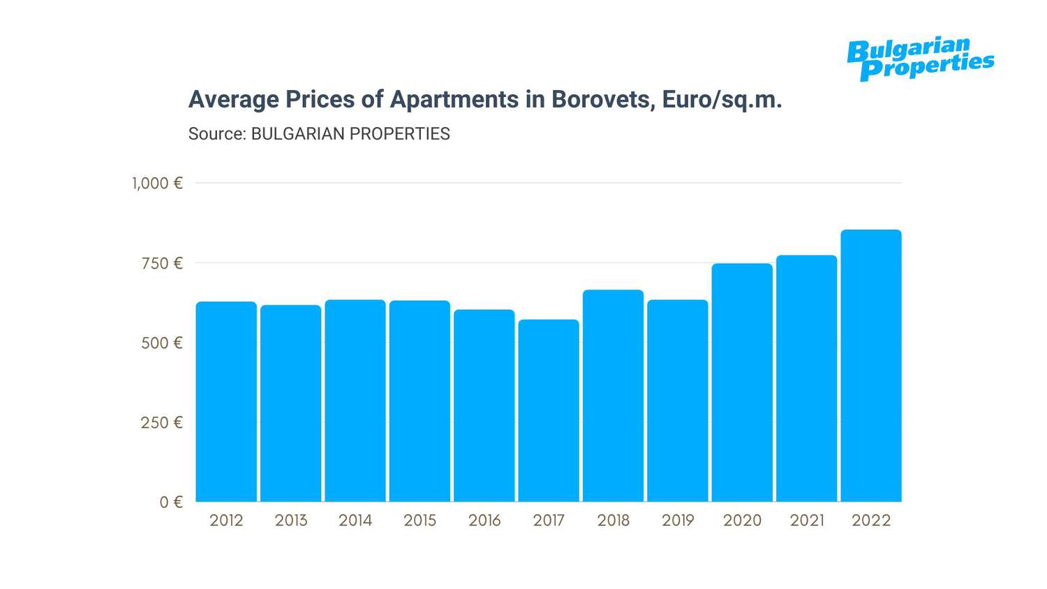 The data of BULGARIAN PROPERTIES indicate that Borovets is the most expensive, but also the most preferred among mountain resorts. The average price there for 2022 is 850 Euros/sq.m. (compared to 770 Euros/sq.m. a year earlier). In the last quarter of 2022, the highest levels were reached - 960 Euros/sq.m., which represents 26% growth on an annual basis. The average purchase price of apartments in Borovets has increased from € 48,300 in 2021 to € 60,500 in 2022. In the last quarter of 2022, the average price of purchased homes in the resort reached peak levels of almost € 68,000.
