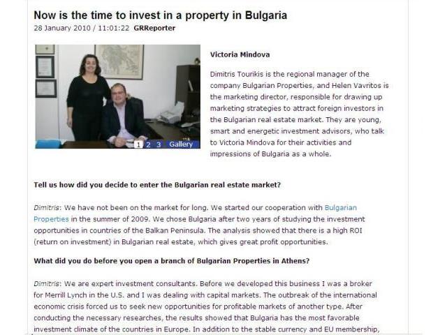 Dimitris: Bulgarian membership in the EU since 2007 and locking the BGN to the Euro are the two main factors that provide zero risk for foreign investors in Bulgarian real estate market. This facilitates buyers from other European countries and provides them with easy access to new opportunities for profit. Also, due to the economic crisis, we can see a decline in property prices across Europe. In Bulgaria this decline marks at around 40% compared with the average price level in 2008. This creates greater opportunity for future profits for people who will invest now. Currently the market has reached its lowest level and from now on property prices will increase. Studies of the Bulgarian office of Bulgarian Properties show that in mid-January, prices have already started to rise. Demand for apartments and offices is increasing, which will inevitably lead to a new boom in prices.