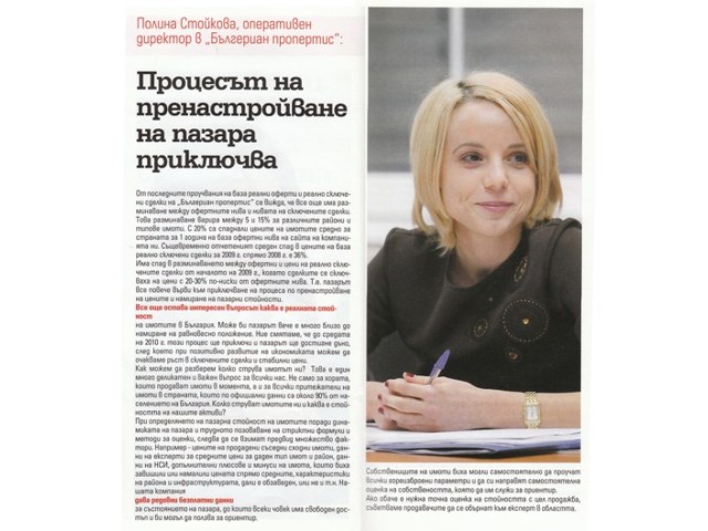 In its March issue the Bulgarian magazine Imam Imot published an article about the actual prices of properties in Bulgaria. In it the Chief Operations Manager of BULGARIAN PROPERTIES Polina Stoykova comments that the market is getting nearer to finishing the process of price readjustment and to finding a balance.