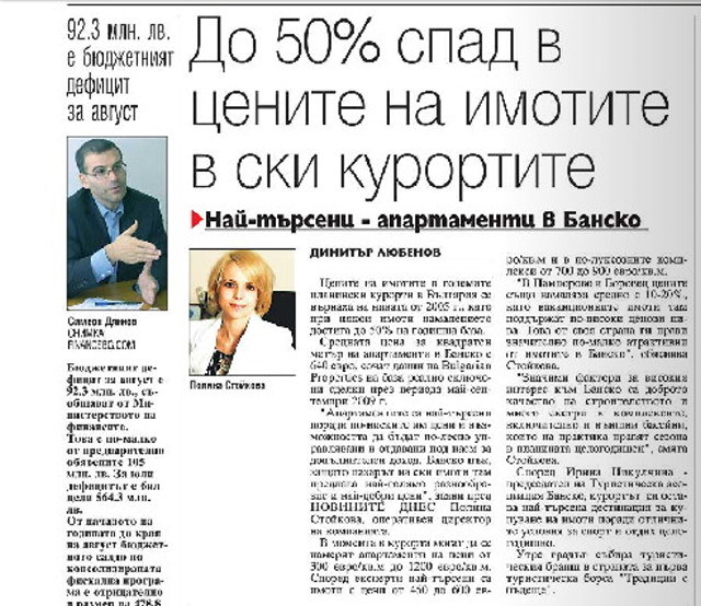 The average price of Bansko apartments is 640 Euro/sq.m., the data of Bulgarian Properties shows based on actual concluded deals during the period May-September 2009. “The apartments are the most sought-after property type in the resort because their prices are more affordable and this type of property can easily be managed and rented out to receive additional income”, said Polina Stoykova – Chief Operations Manager of Bulgarian Properties, for NOVINITE DNES newspaper.