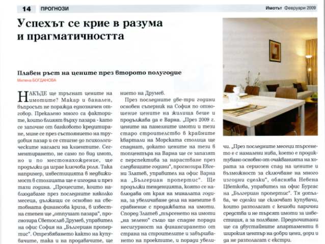 How will property prices change? Though banal, the question does not have a simple answer. The factors that influence the market are too many – the more complex lending process, the situation on the labor market and the clients’ attitude are just some of them. The segmenting – not just by property type but also by location will also continue to be a key factor. For example, the investment in real estate in the capital Sofia will be sensible in 2009 as well. “The processes we have been witnessing in the last few months are mainly due to the global financial crisis and to some extent will “open” the market”, says Svetoslav Drumev, Manager of BULGARIAN PROPERTIES’ Sofia office. The sobering down of both sellers and buyers will lead to the realization of only the good projects. This, on its part, will increase the quality of the product offered. “At the moment the investment in a quality home is very reasonable. Prices will become more stable and around the middle of the year they will start to gradually increase. This trend will remain until the end of the year,” Mr. Drumev adds.