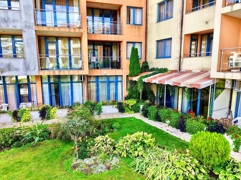 Today's offer includes a one bedroom apartment with panoramic views of the courtyard with swimming pool of a well maintained gated complex with amenities - Poseidon. Located in a nice central area of Sunny Beach beach resort, close to the beach (100 m) and 100 m from a bus stop