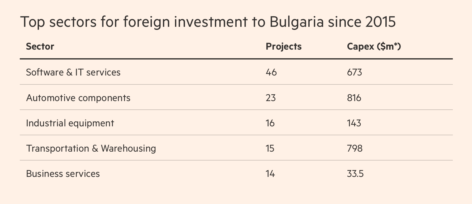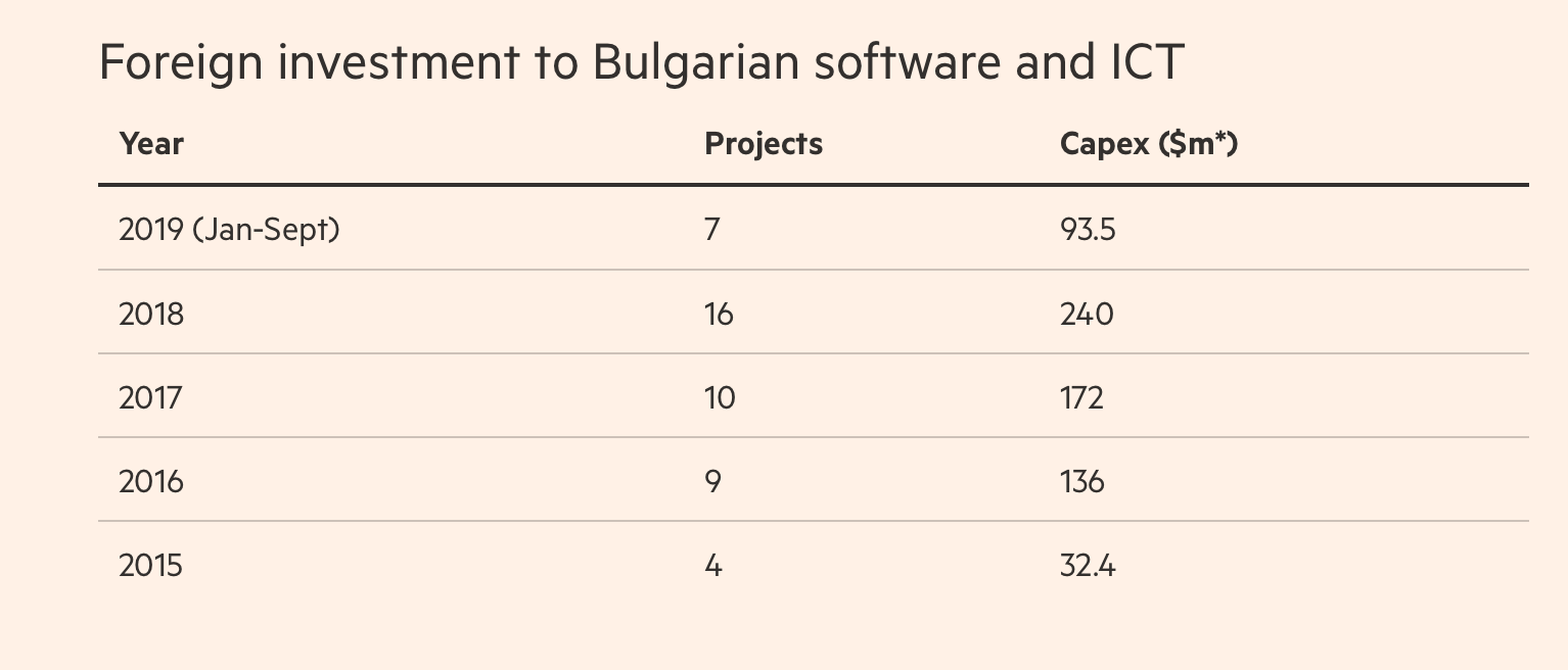 Bulgaria received a record amount of foreign investment in software and ICT services in 2018, with at least 16 projects valued at $240m, mostly in Sofia. Foreign investments in the sector have risen continuously since 2015, according to fDi Markets, an FT data service that tracks announcements by foreign companies of greenfield investments, which result in new facilities and jobs.