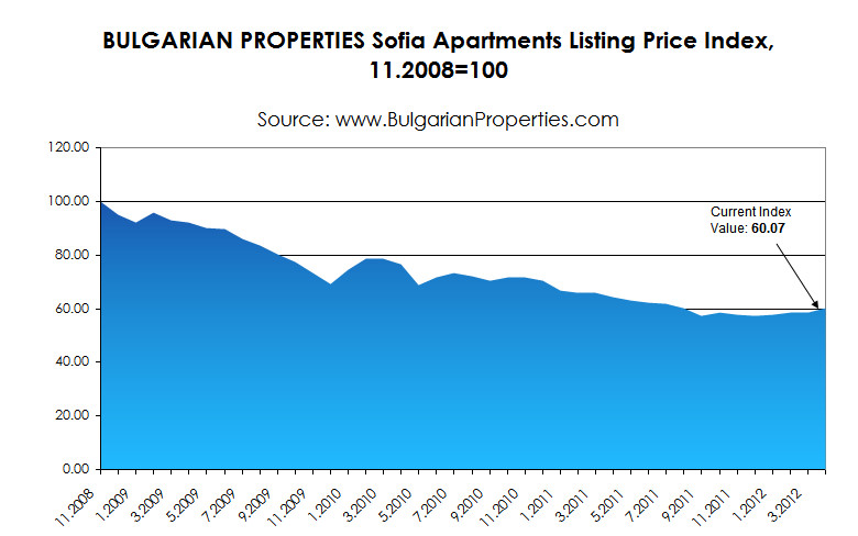 The current BULGARIAN PROPERTIES Index value for the listing prices of apartments in Sofia for April 2012 is 60.07 points. The average monthly listing price of the apartments in the capital is 898 Euro/sq.m.