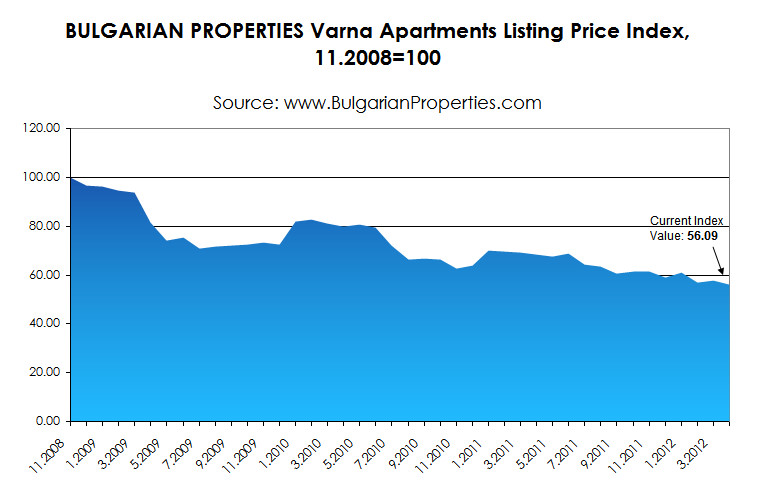 The current BULGARIAN PROPERTIES Index value for the listing prices of apartments in Varna for April 2012 is 56.09 points. The average monthly listing price of the apartments in the second biggest city in Bulgaria is 835 Euro/sq.m.