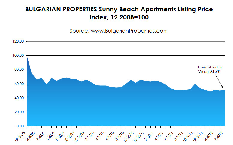 The current BULGARIAN PROPERTIES Index value for the listing prices of apartments in Sunny Beach for April 2012 is 51.79 points. The average monthly listing price of the apartments in the biggest beach resort in Bulgaria is 685 Euro/sq.m.
