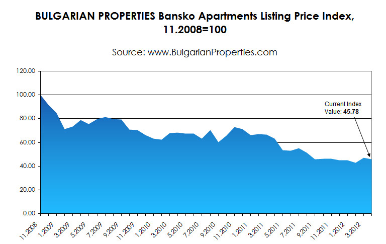 The current BULGARIAN PROPERTIES Index value for the listing prices of apartments in Bansko for April 2012 is 45.78 points. The average monthly listing price of the apartments in the biggest ski resort in Bulgaria is 586 Euro/sq.m.