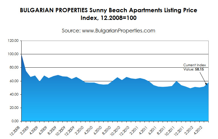 The current BULGARIAN PROPERTIES Index value for the listing prices of apartments in Sunny Beach for May 2012 is 58.15 points as Sunny Beach apartment pries have started to show positive movements due to an increase in demand by Russian buyers and an already started summer season. The average monthly listing price of the apartments in the biggest beach resort in Bulgaria is 769 Euro/sq.m., compensating the drop from the previous months and returning to values from early 2011.