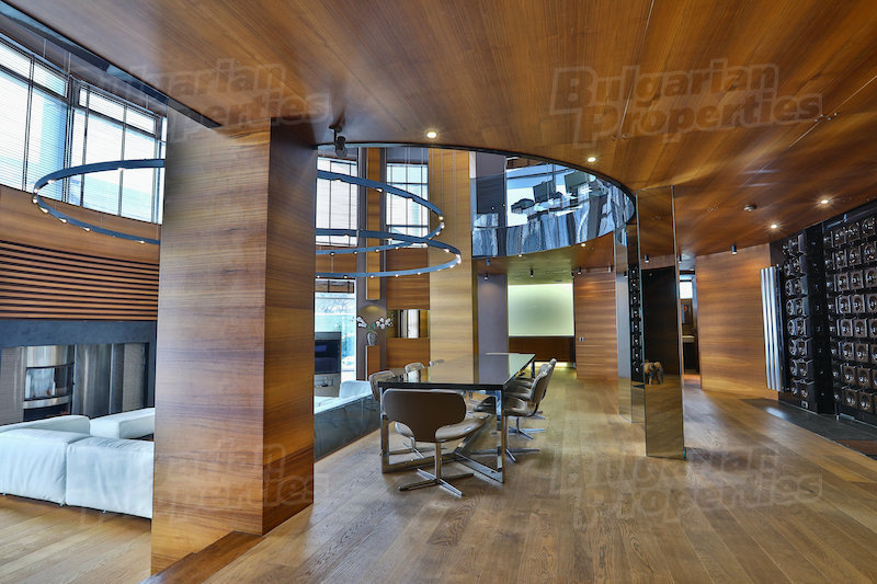 The dominant feature is a two-story living room rotunda wrapped in tall windows with views of Vitosha mountain to the south and downtown Sofia to the north. The room is anchored by a large fireplace and a circular light fixture that appears to float. The dining area, which contains a table that seats eight, is a step up from the open living area. A circular wood pattern on the ceiling swirls to a skylight in the center.