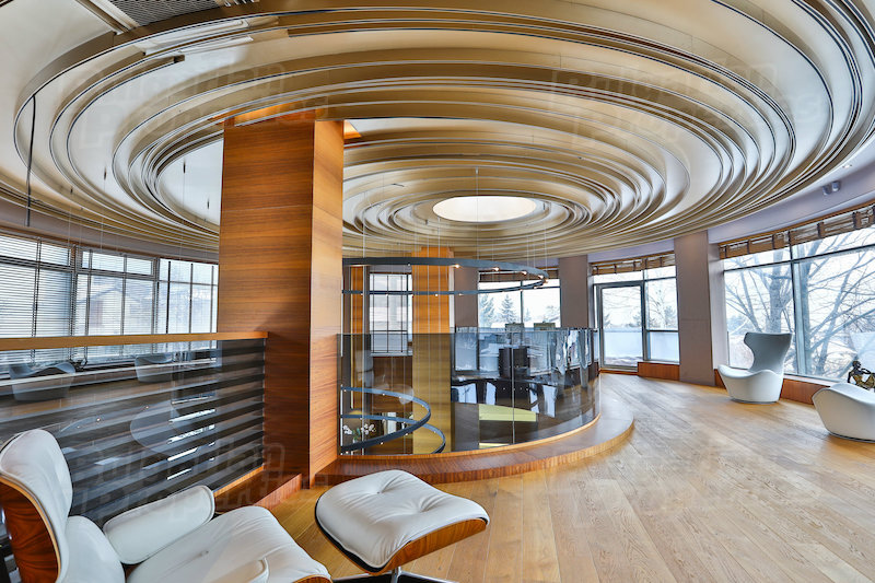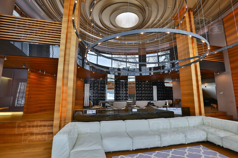 The dominant feature is a two-story living room rotunda wrapped in tall windows with views of Vitosha mountain to the south and downtown Sofia to the north. The room is anchored by a large fireplace and a circular light fixture that appears to float. The dining area, which contains a table that seats eight, is a step up from the open living area. A circular wood pattern on the ceiling swirls to a skylight in the center.