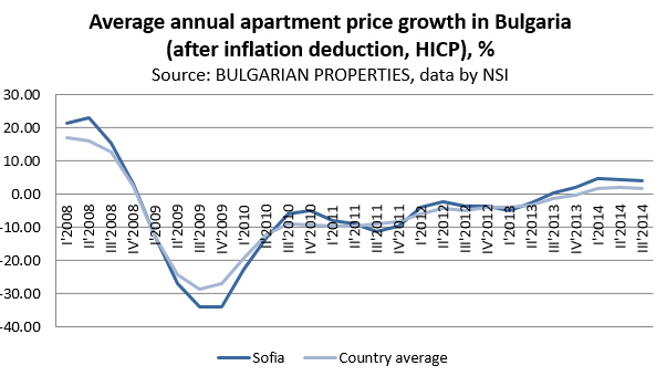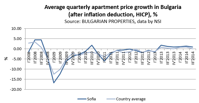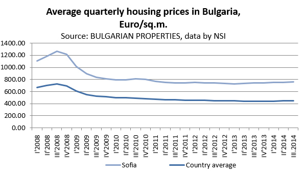 During the third quarter of 2014, the growth rate of the property prices slightly slowed down, but in all three quarters of the year it keeps levels of more than +1.5% on average for the country and over +4% in the capital of Sofia.