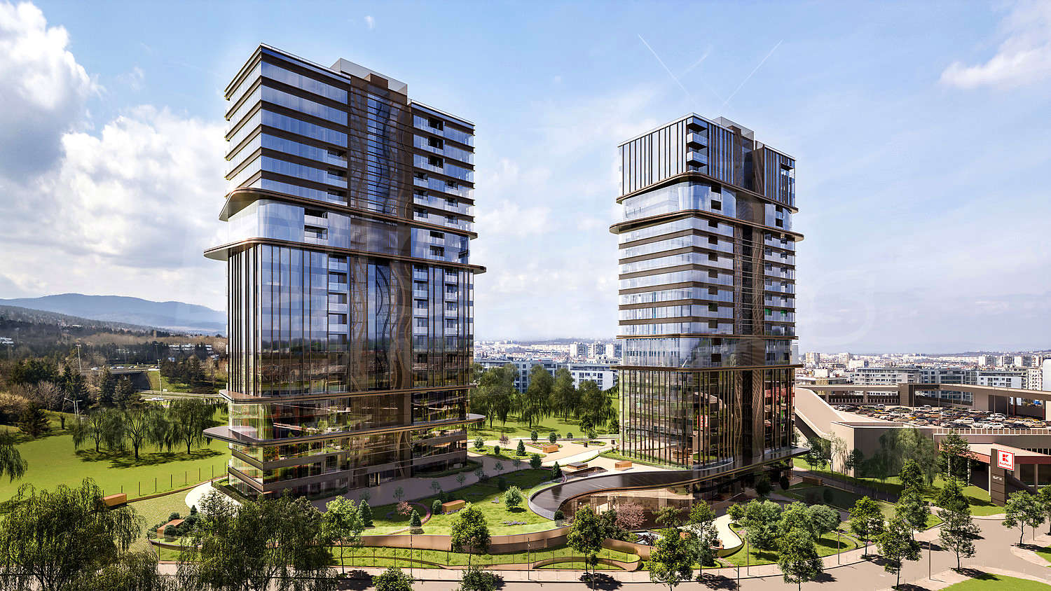 SKY TOWERS brings together two high-rise buildings oriented towards each other, forming a distinctive silhouette. The architectural vision is inspired by the unique location – where the city meets the mountain.