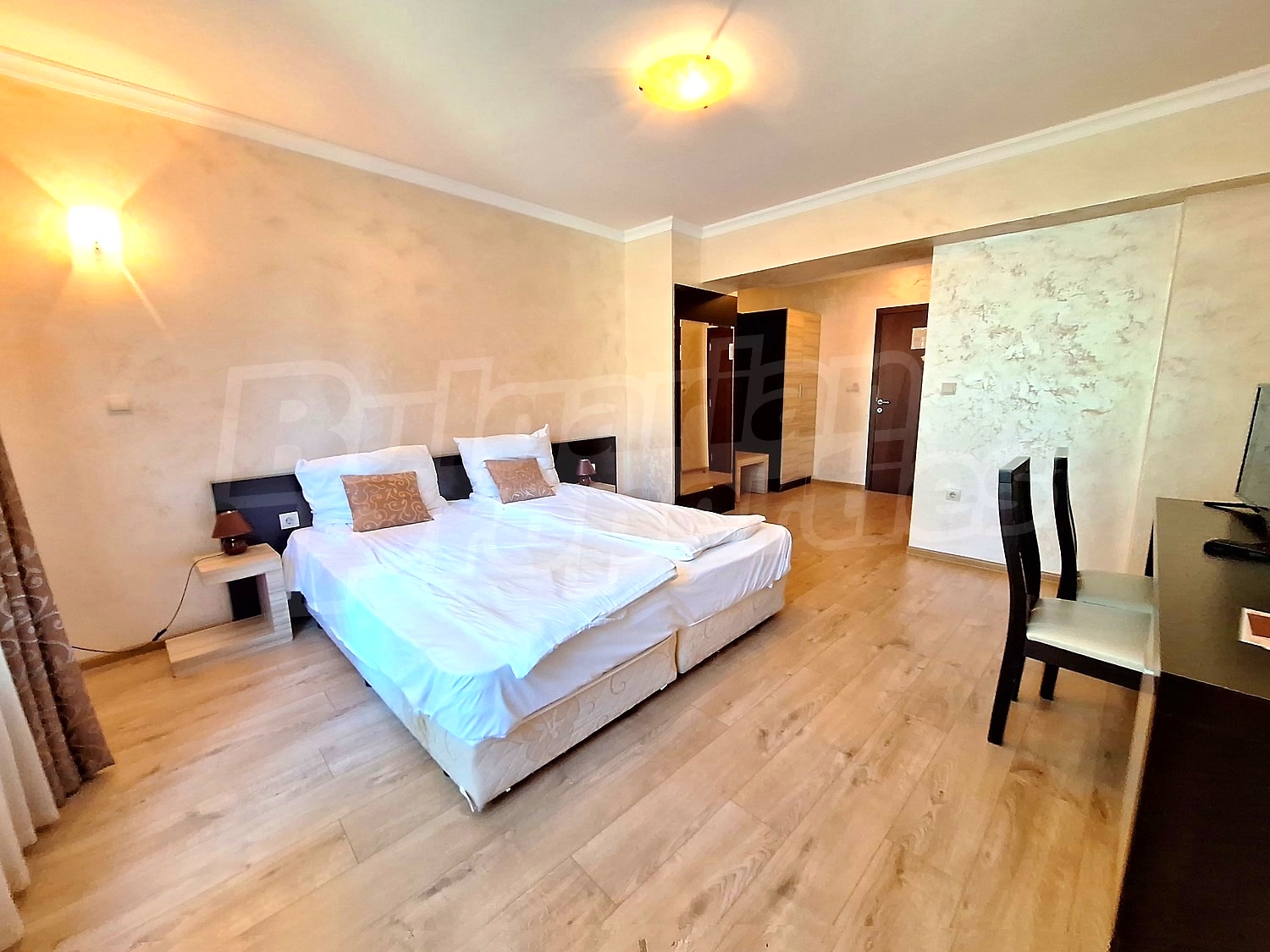• Living room with sleeping area - large bedroom, two bedside tables, wardrobe, desk with two chairs, small refrigerator;