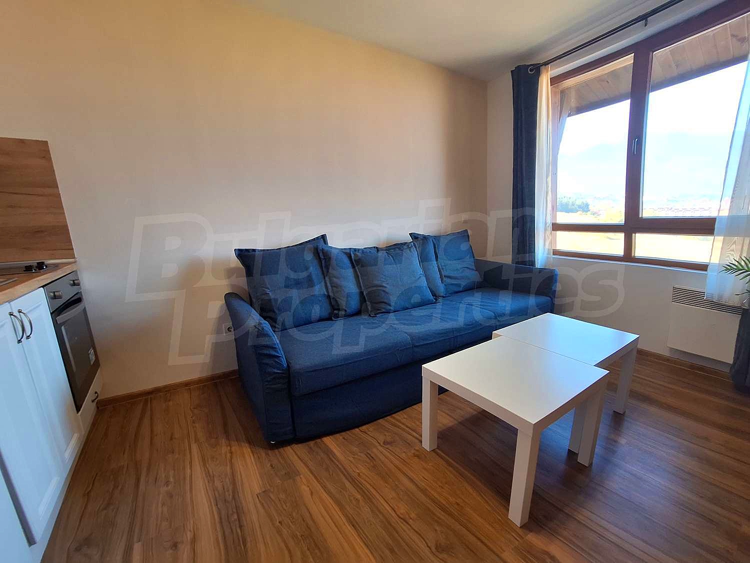 The studio consists of a living area with space to sleep, a kitchenette and dining area, as well as a modern bathroom with shower. The space has been optimised with attention to detail so that it offers all the amenities needed for permanent living, holiday use or rental. Although the property does not have a terrace, it offers a beautiful view of the Pirin Mountains that creates a feeling of tranquility and mountain harmony.