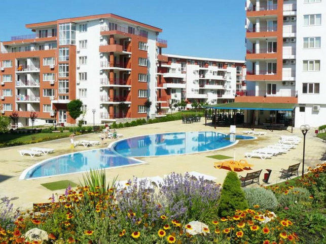 The apart-hotel has seafront location, with well-maintained common areas and a variety of modern amenities, including 3 restaurants, bar, cafe, 10 swimming pools, one with artificial waves and other with Jacuzzi, five children's swimming pools with water attractions, 6 children's playgrounds, two food stores, one for meat and shop for beach accessories, souvenirs and clothes, beauty salon with hairdresser, manicure, pedicure, SPA center with hammam, sauna, laundry service, currency exchange office, pharmacy, medical center, fitness center, tennis court / mini football pitch, outdoor fitness equipment, mini golf, table tennis and billiards, volleyball court, bikes rental, electronic games, library and children's entertainment center. The complex offers free parking lot, internet and swimming pool lounge chairs.