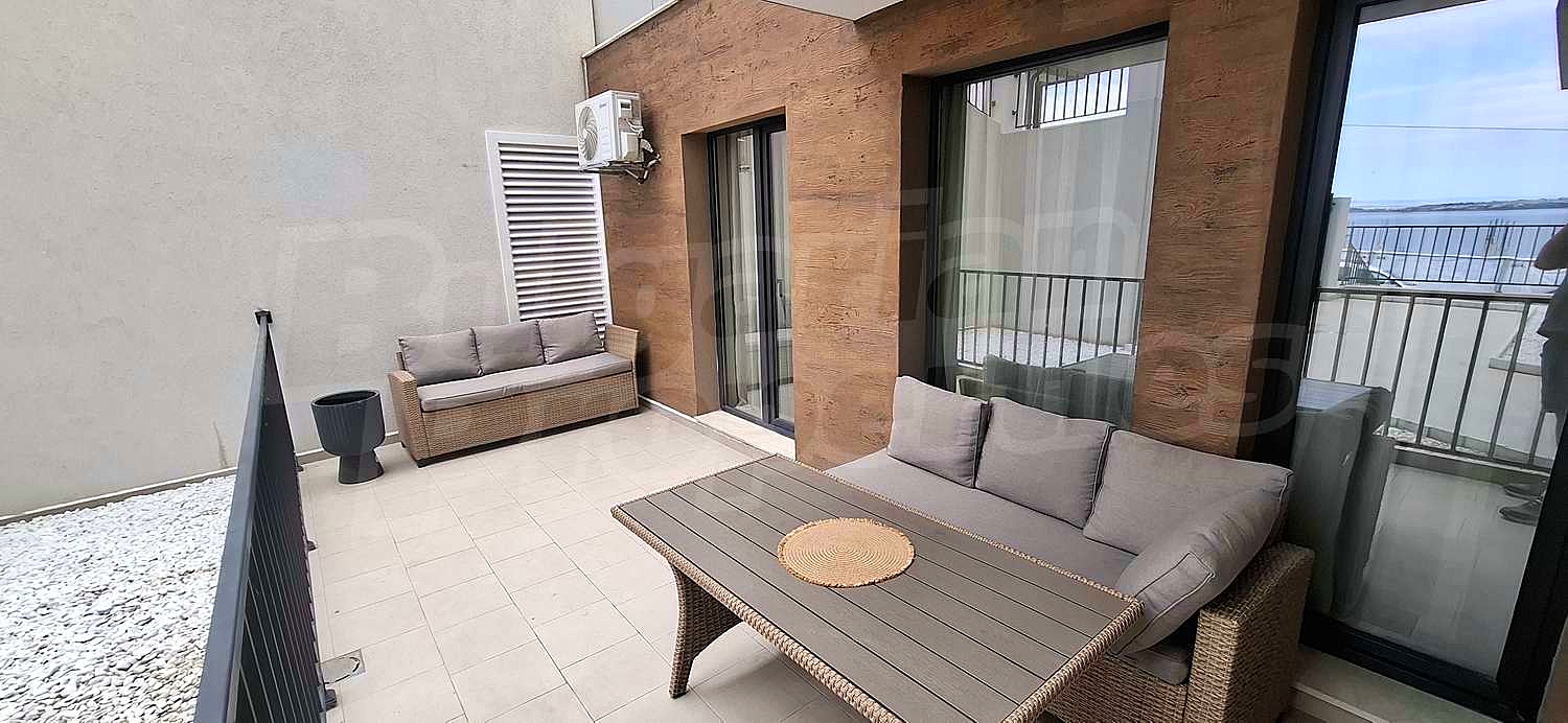 The layout is well designed and functional, comprising a bright living room with a modern kitchenette, a comfortable bedroom, a bathroom with WC, and direct access to the veranda – a perfect place to relax and enjoy the fresh coastal air. The apartment is tastefully finished and comes fully furnished with brand-new furniture and appliances, making it ready for immediate occupancy or rental.