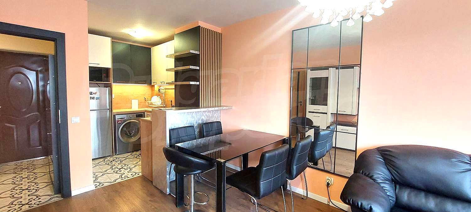 - A spacious living room with kitchenette, where the modern kitchen is equipped with all necessary appliances and the dining and relaxation area offers complete comfort for everyday life;